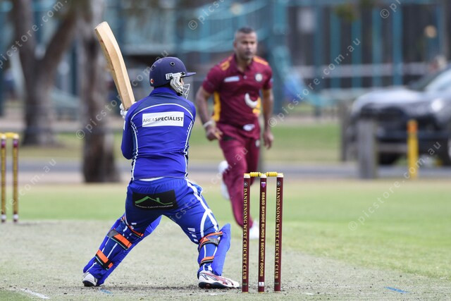 Justin Rowswell (Parkmore) hits a ball from bowler Dinesh Nuwan Kulasekara (Dandenong West). 509518_15