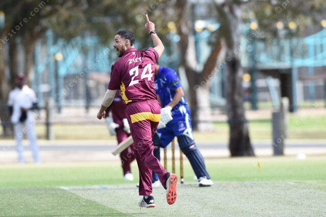 Bowler Joel Zietsman (Dandenong West) celebrates after Harmanpreet Singh (Parkmore) is bowled. 509518_17