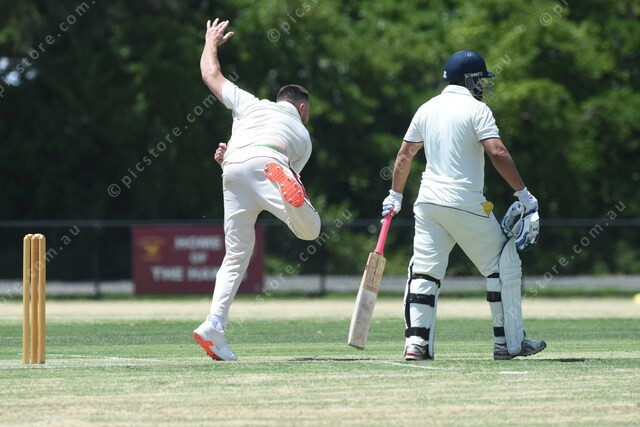 William Whyte (Hallam) bowls to Kyle Hardy (Narre South). Batsman watching is Morteza Ali (Narre South). 452633_04