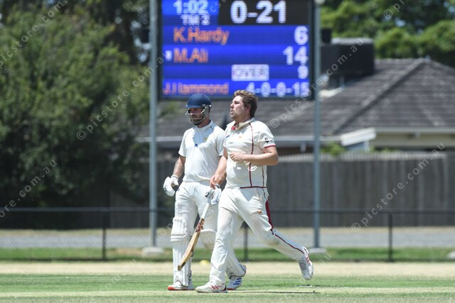 Jordan Hammond (Hallam) bowls to Morteza Ali (Narre South). Batsman watching is Kyle Hardy (Narre South). 452633_13