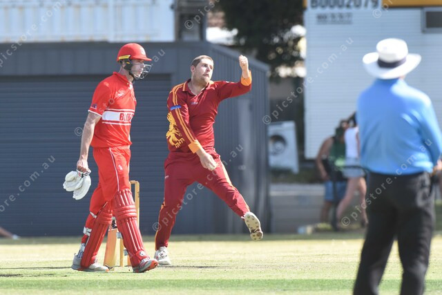 Jordan Hammond (Hallam) bowls to Paul Hill (Springvale South). Batsman watching is Nicholas Boland (Springvale South). 460837_11