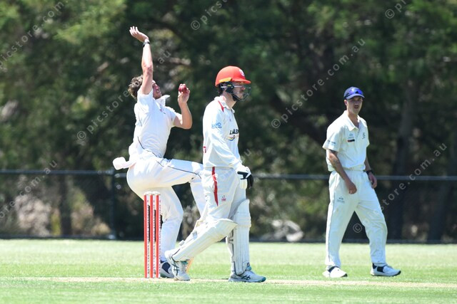 James Trodd (Berwick) bowls to Cameron Forsyth (Springvale South). batsman watching is Mitchell Forsyth (Springvale South). 456348_07
