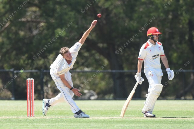 James Trodd (Berwick) bowls to Mitchell Forsyth (Springvale South). Batsman watching is Cameron Forsyth (Springvale South). 456348_10
