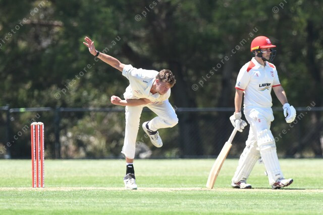 James Trodd (Berwick) bowls to Mitchell Forsyth (Springvale South). Batsman watching is Cameron Forsyth (Springvale South). 456348_11