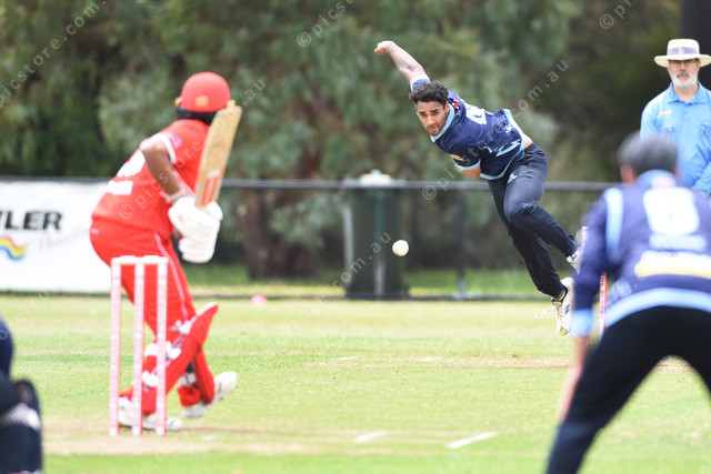 Triyan De Silva (Buckley Ridges) bowls to Dasun Opanayaka (Springvale South). 525927_03