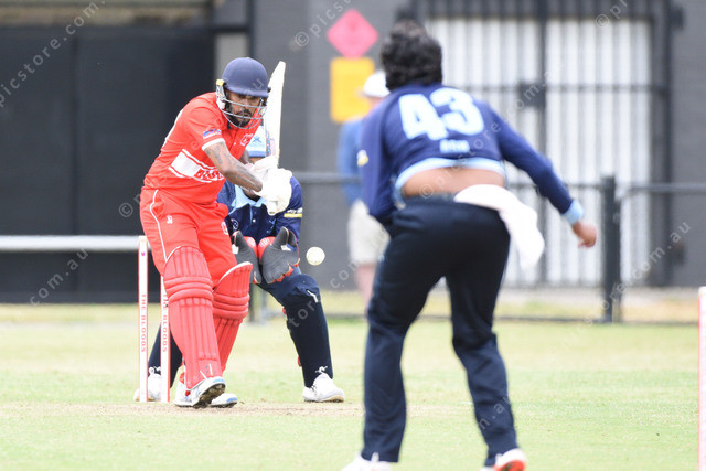 Chathuranga De Silva (Springvale South) faces a ball from Ashen Hettinayaka (Buckley Ridges). 525927_08