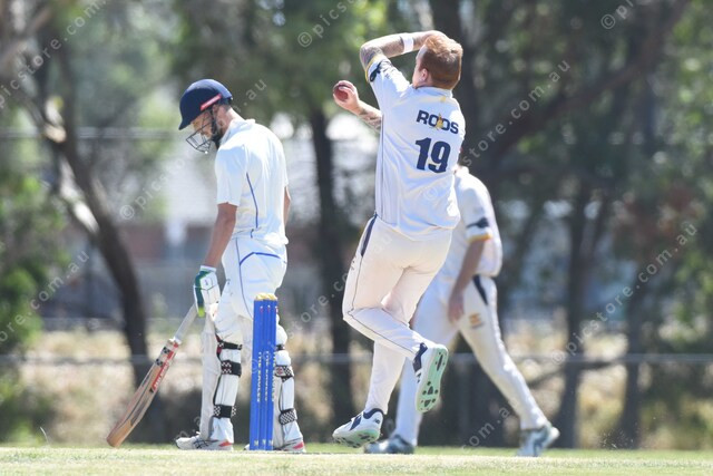 Joel Robertson (Coomoora) bowls to Justin Dickinson (Cranbourne). Batsman watching is Tim Fathers (Cranbourne). 453800_02