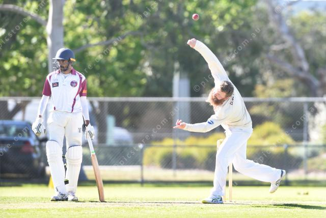 S Weir (Dandenong West) bowls to James Wright (Keysborough). Batsman watching is C Perera (Keysborough). 369687_07