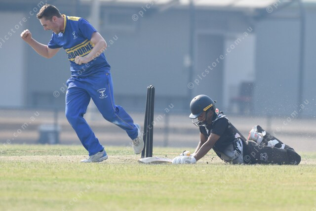 Batsman Hulangamuwa (Narre Warren) is out in this moment. Bowler Dickinson (Cranbourne, left) celebrates. 527666_25