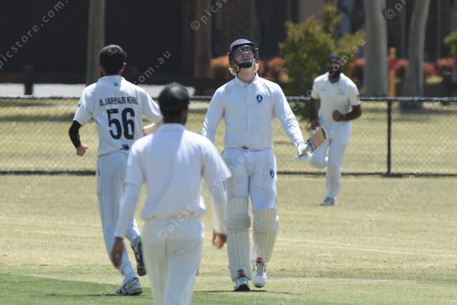 Riley Hillman (Berwick Springs) is out. Bowler Asadullah Jabbar Khil (Fountain Gate) runs up the pitch. 455071_08