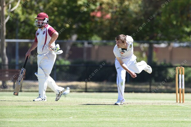 Ben Lees (St Mary’s) bowls to Dante HAPPAWANA (Keysborough). Batsman watching is Jackson O’Brien (Keysborough). 530025_12
