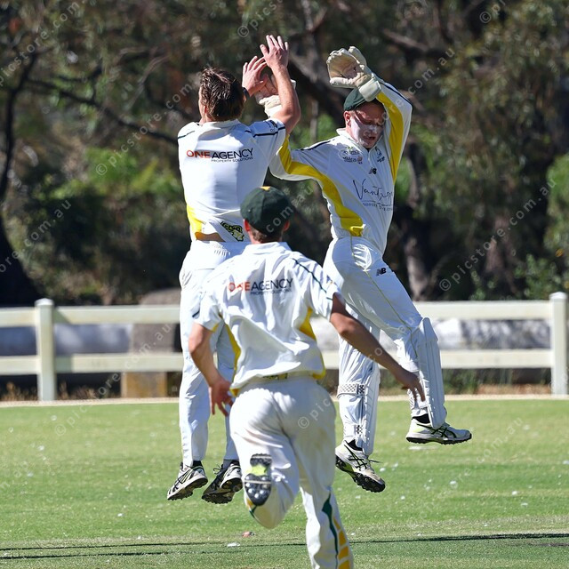Sandy Creek players celebrate the wicket of Ben McMullen. (524624_09)