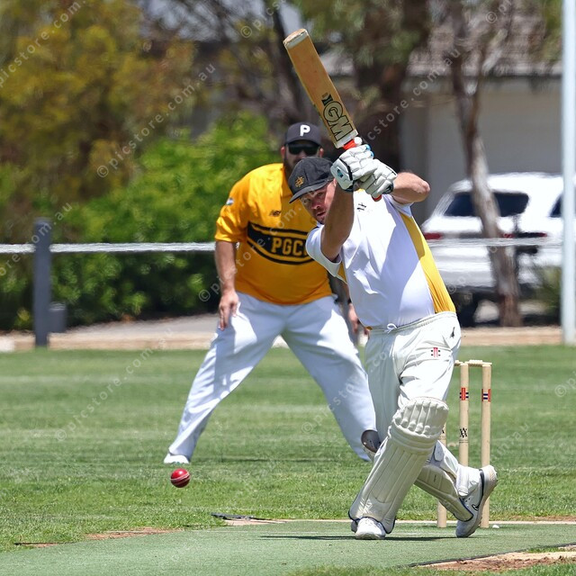 Angle Vale’s Aaron Meredith sends one straight back at the bowler. (521350_01)