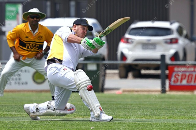 Quirk gets a thick inside edge after going down for a slog-sweep. (521350_07)