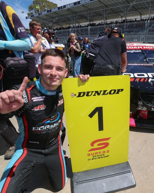 Brad Vaughan celebrates after securing a home state Super2 win in Adelaide. (Supplied: Facebook/Brad Vaughan Racing)