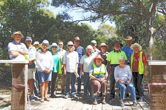 Friends of Nangawooka Flora Reserve volunteers on the deck created out of old Causeway sleepers. (Dee Elferink: 529504_02)