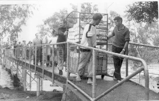 FLOODING: An undated image of workers bring trollies of bread across the pedestrian bridge over the Todd River (PIC: SUPPLIED)