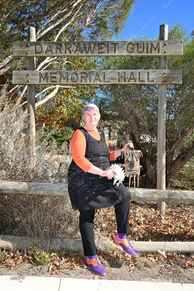 Viki Spedding standing in front of the Darraweit Guim War Memorial Hall holding one of the items that will be auctioned as part of an annual fundraiser for the hall. Photo by Damjan Janevski. 473716_02