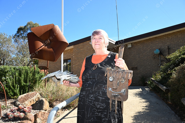 Viki Spedding standing in front of the Darraweit Guim War Memorial Hall holding one of the items that will be auctioned as part of an annual fundraiser for the hall. Photo by Damjan Janevski. 473716_03