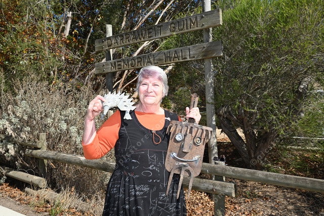Viki Spedding standing in front of the Darraweit Guim War Memorial Hall holding one of the items that will be auctioned as part of an annual fundraiser for the hall. Photo by Damjan Janevski. 473716_04