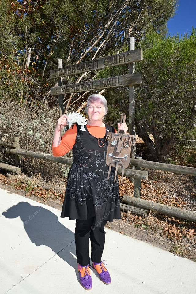 Viki Spedding standing in front of the Darraweit Guim War Memorial Hall holding one of the items that will be auctioned as part of an annual fundraiser for the hall. Photo by Damjan Janevski.