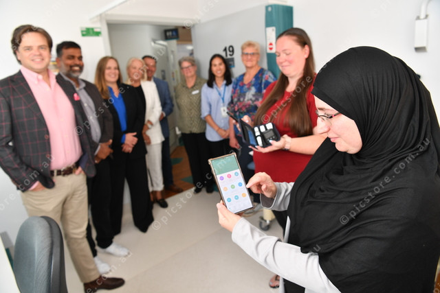 Pic of Wyndham Health Foundation board members, Mercy Health staff and patients Mouna Haddara (front) and Erin Modrich; promoting a new app the helps diabetics. Photo by Damjan Janevski. 463913_05