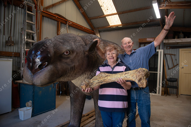 Mary and Ken Bates, from the Yankalilla District Historical Museum, show off the new life-sized Diprotodon model and a replica bone. (Dani Brown: 468360_01)