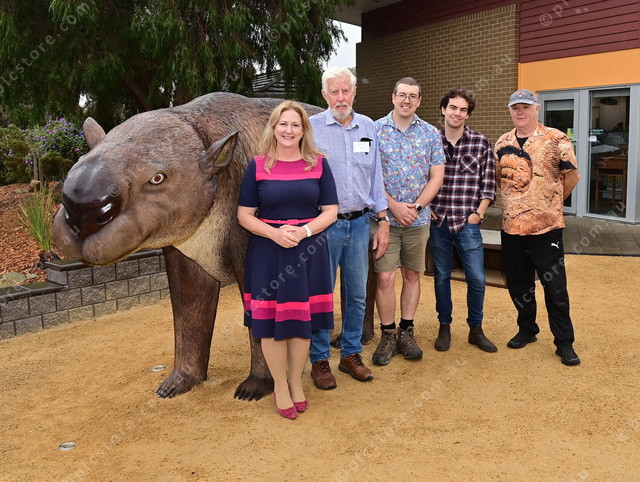 Rebekah Sharkie, Rob Ryan, Aaron Camens, Fraser Brown and Rob Kirk stand proudly in front of the Diprotodon at the Fleurieu Coast Visitor Centre. (Mark Liebich: 471033_01)