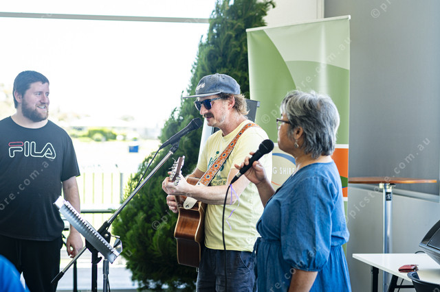 522611_09 Percussion workshop – run by Shaun Spencer who is on guitar. Will need to get name of woman on microphone from organisers or Kyeema.