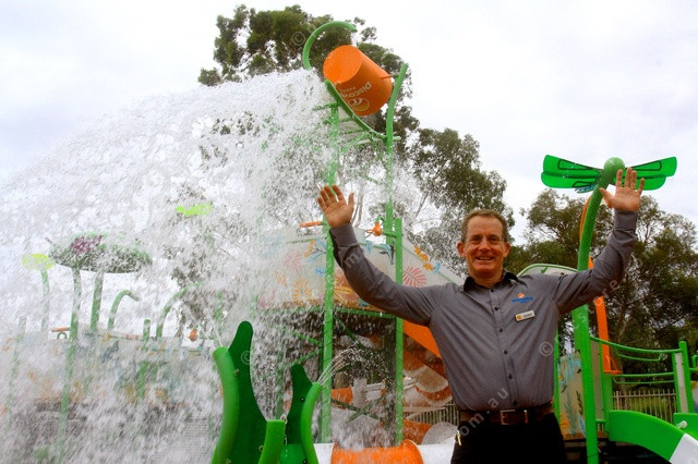 60 LITRES: Water splashes as the bucket dumps its contents on Discovery Parks Founder and CEO Grant Wilckens. (PIC: PHIL WILLIAMS 517839_05)