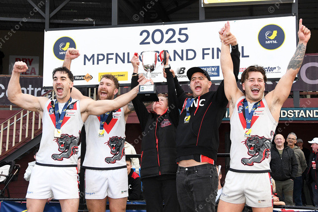 Co-captains Joel Hillis, (left) and Nick Battle (right) along with Helen Flanigan and co-coaches Dean Kent and Ryan Hendy lift the premiership cup 503287_36