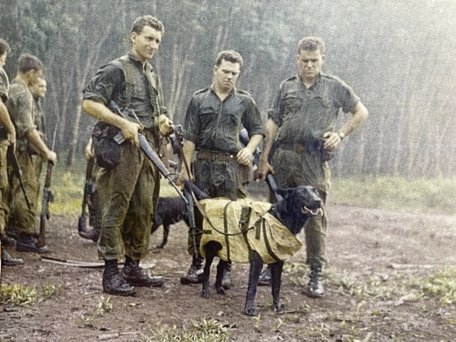 Corporal Chris O’Neil, Private Robert Goodger, Cpl Norman Cameron with tracking dog Tiber, Pte Gordon Hay and Cpl Reginald Parker. Tiber wears a harness designed to allow dogs to be inserted or extracted from battle. (Australian War Memorial)