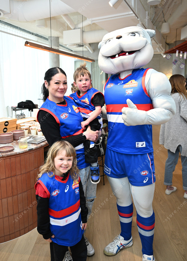 Program where parents can access skills. Pic of mum of Ashleigh Malone, her kids Harley (4) and Bear (3), with the Bulldogs mascot. (Damjan Janevski). 489983_05