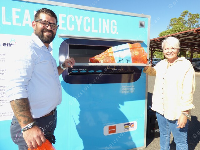 RECYCLING: ASTC Mayor Matt Paterson and Envirobank founder Narelle Anderson making the first drop off of recyclable containers. (Charles Geary: 461154_02)