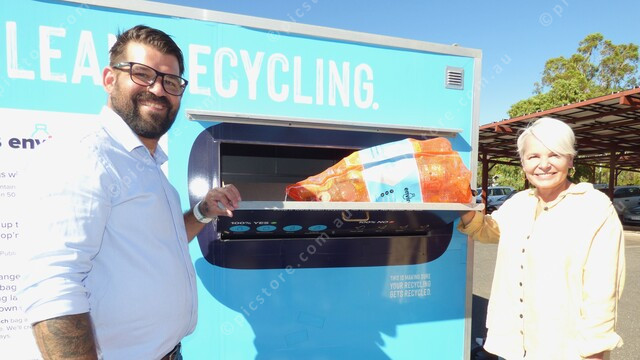 RECYCLING: ASTC Mayor Matt Paterson and Envirobank founder Narelle Anderson making the first drop off of recyclable containers. (Charles Geary: 461154_03)