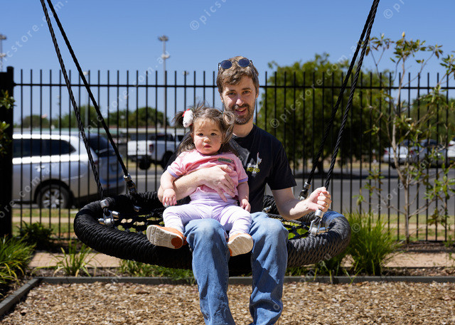 Kurumi Turne enjoys a swing with Matthew Turner at the Red Cliffs Early Years Hub in Red Cliffs on Sunday 07 Dec 2025.