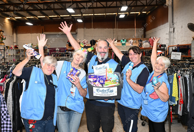 ‘Helping Hands’ is running an Easter Egg drive. Pic of: volunteers Maria Mauro, Glenys Long, relationship manager Adam Volpato, store manager Kylie Reid and volunteer Cheryl Pernar. Photo by Damjan Janevski. 470568_02