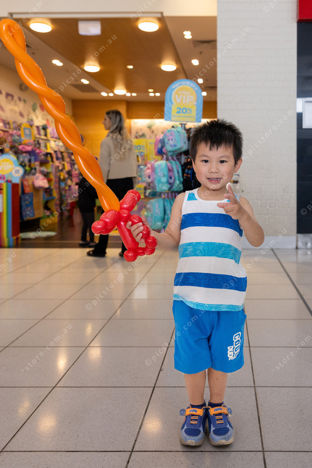 3yo Ethan from Pakenham with his sword of twisted balloons.