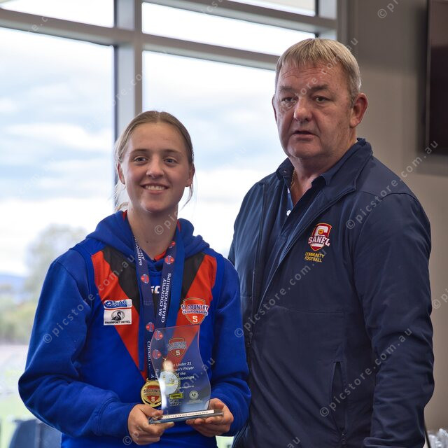 Madeline Nuss, Eastern, was awarded Best Under 21 Women’s Player of the Championships by Brad Busch from SANFL community football