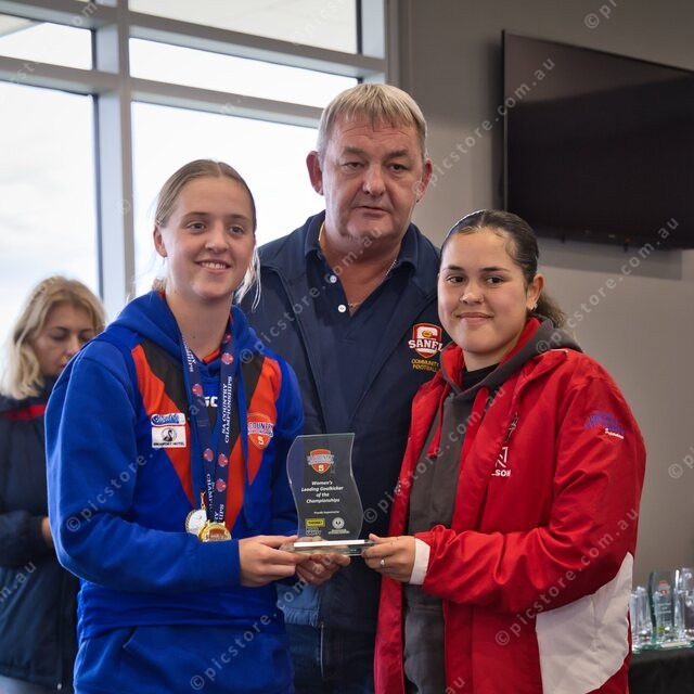 Madeline Nuss, Eastern, and Tamika Reid, Northern, were named joint Women’s Leading Goal Kickers of the Championship by Brad Busch from SANFL community football