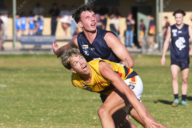 Riley McLeod (Catani) and Lachlan Willis (Longwarry) jostle for position at a boundary throw in.476827_04