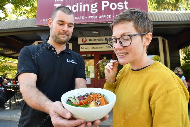 Edgy Vege competition. Pic of Mt Macedon Trading Post owner Damien Leatch and Emily Gloyns from Veg Action Group. Photo by Damjan Janevski. 464936_07