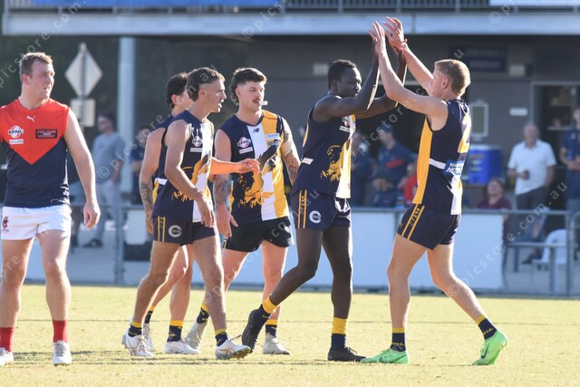 Jafar Ocaa (30 Beac, middle, arms up) kicks a goal. Teammate right Jake Bowd (2). 476846_09