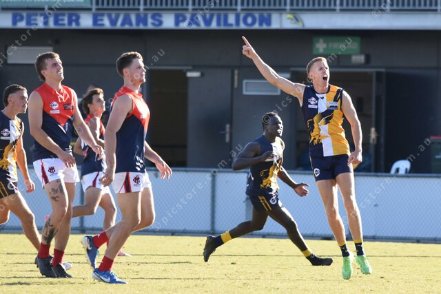 Jake Bowd (2 Beac) after kicking a goal. Behind is fellow Goal kicker Jafar Ocaa (30 Beac) who kicked a goal only three mins earlier. 476846_13