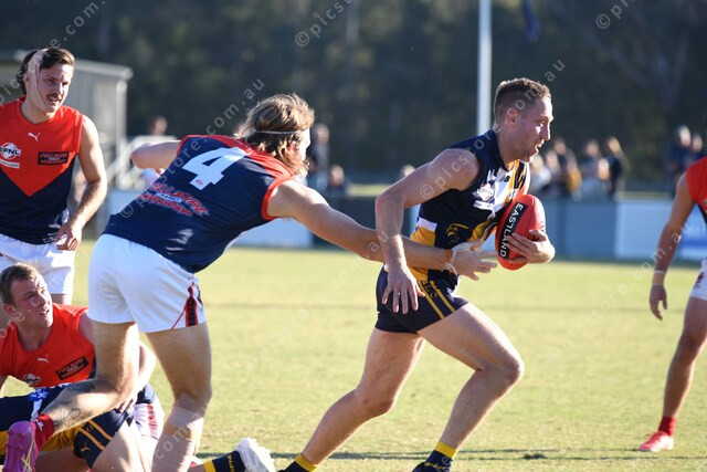 Jack Diedrich (4 Montrose) grabbs Damien Johnston (14 Beac). Damien will kick a goal with this run. 476846_19