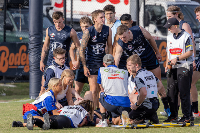 The players gather around and wish him well. A Berwick player was injured and the game stopped until he was taken to hospital by ambulance.