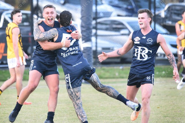 James McLean (57 Berwick, middle) after his goal in the last quarter. Teammate Ashton Williamson (4). 479942_24
