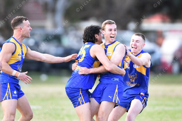 Last moments of the game, Joshua Stern (8 NP, blonde) kicks a goal and puts Noble Park back in front. 496429_28