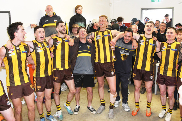 FOOTY SHORTS Rowville ressies sing the song after their prelim win. 503001_05