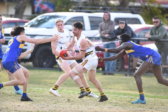Matt Davey (22 Rowville) with the ball, Right is #62 Noble Park (No 62 on the list), Left is Joshua Tour (25 Noble Park). 486765_11